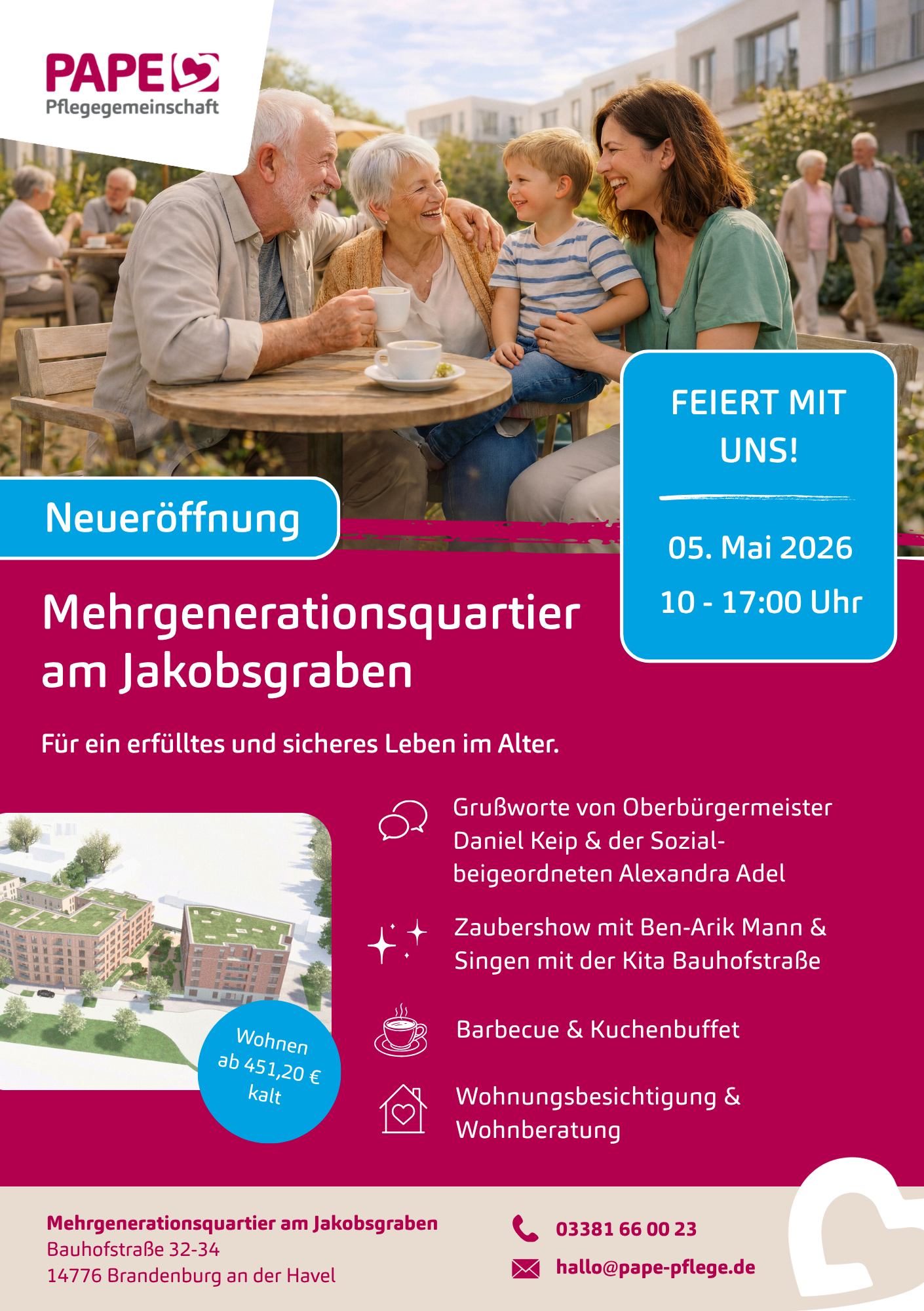Endlich ist es so weit: Die PAPE Pflegegemeinschaft lädt herzlich zur offiziellen Eröffnung des neuen Mehrgenerationsquartiers am Jakobsgraben ein. Am 05. Mai 2026 erwartet Besucherinnen und Besucher von 10:00 bis 17:00 Uhr in der Bauhofstraße 32–34 in Brandenburg ein abwechslungsreicher Tag voller Begegnungen, Unterhaltung und Einblicke in ein besonderes Wohnprojekt.